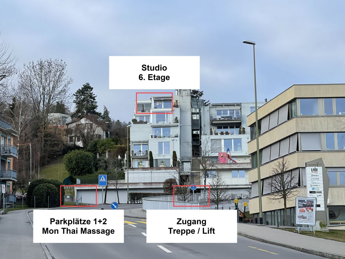 Das Studio befindet sich ganz oben in der sechsten Etage und kann über eine Aussentreppe oder rollstuhlgängig mit dem Lift erreicht werden. Der Zugang zur Treppe und zum Lift ist angeschrieben mit Hausnummer 42/44.